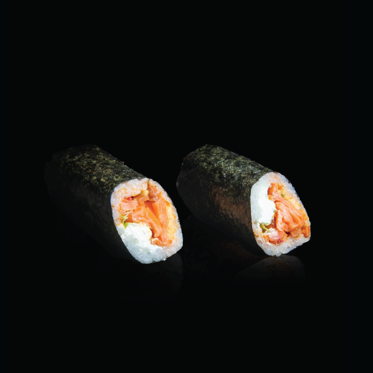 ბრინჯი, ნორი, კრევეტები, ტერიაკის ბოსტნეული, სალათის ფურცელი, კიტრი, ომლეტი ტომაგო, ტომიამის სოუსი.