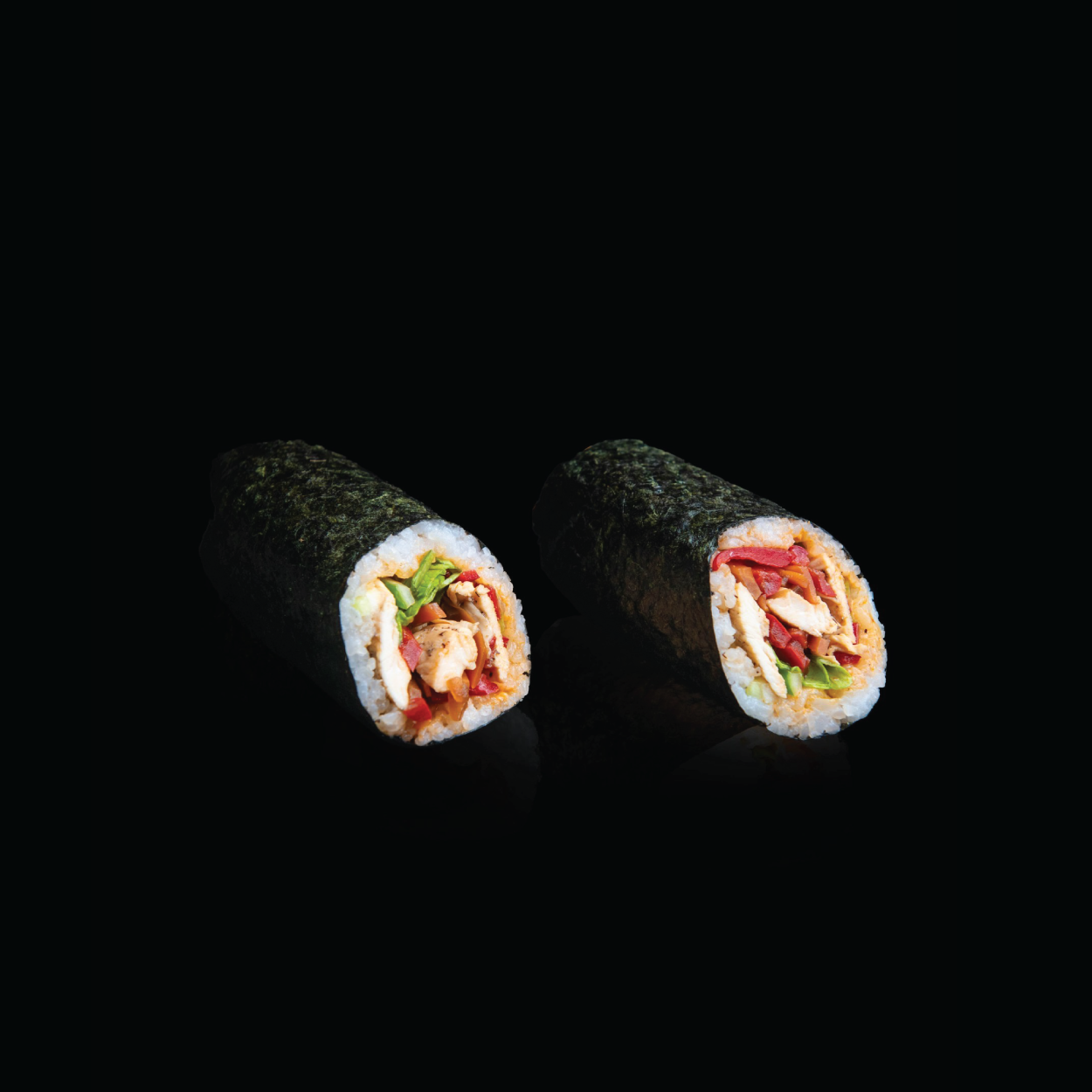ბრინჯი, ნორი, ქათამი, ტერიაკის ბოსტნეული, სალათის ფურცელი, ბულგარული, ხახვი, ჩილის სოუსი.
