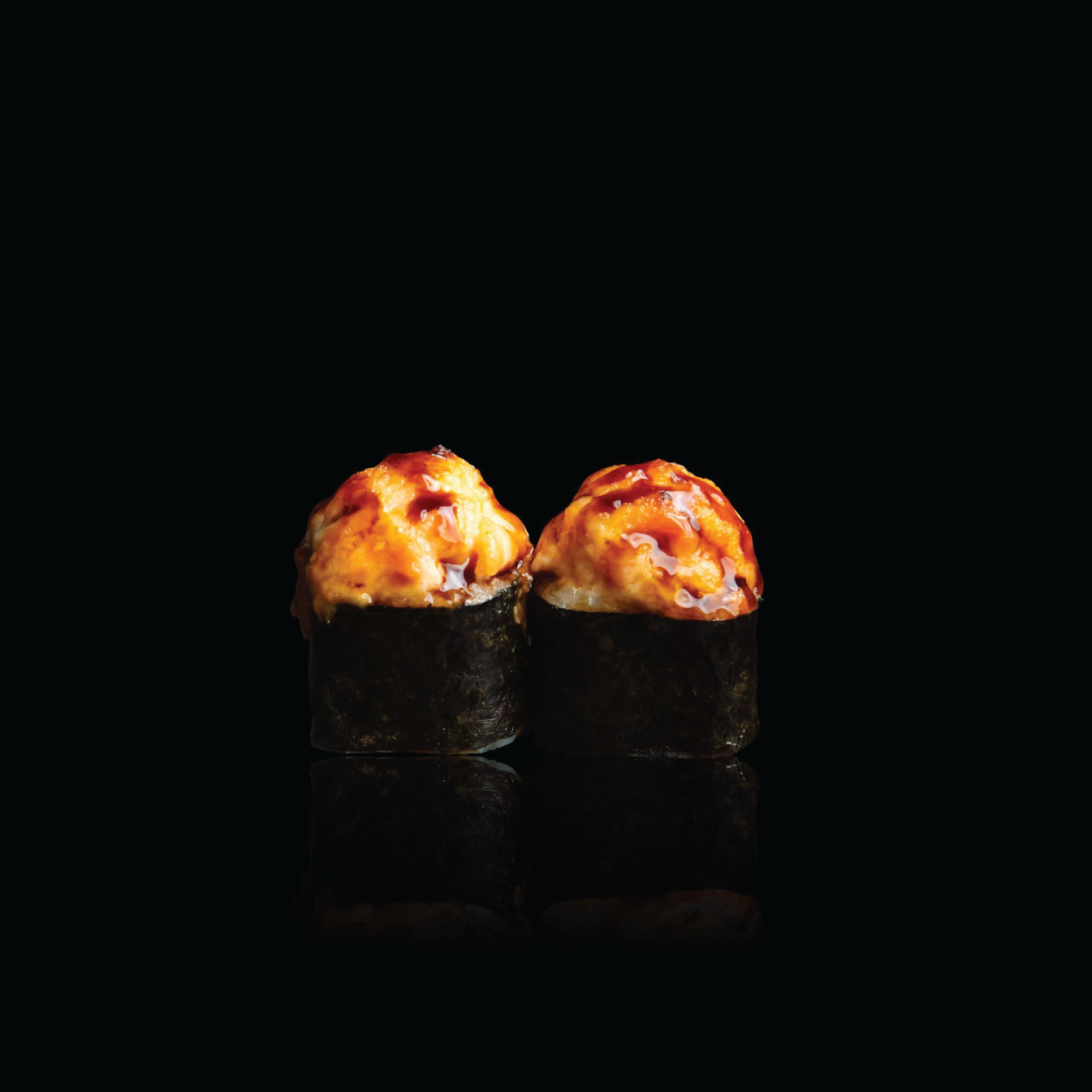 ბრინჯი, ნორი, კრევეტები, ორაგული, ყველის სოუსი, კრემ-ყველი, უნაგი სოუსი, ჯინჯერი, ვასაბი, სოიოს სოუსი.