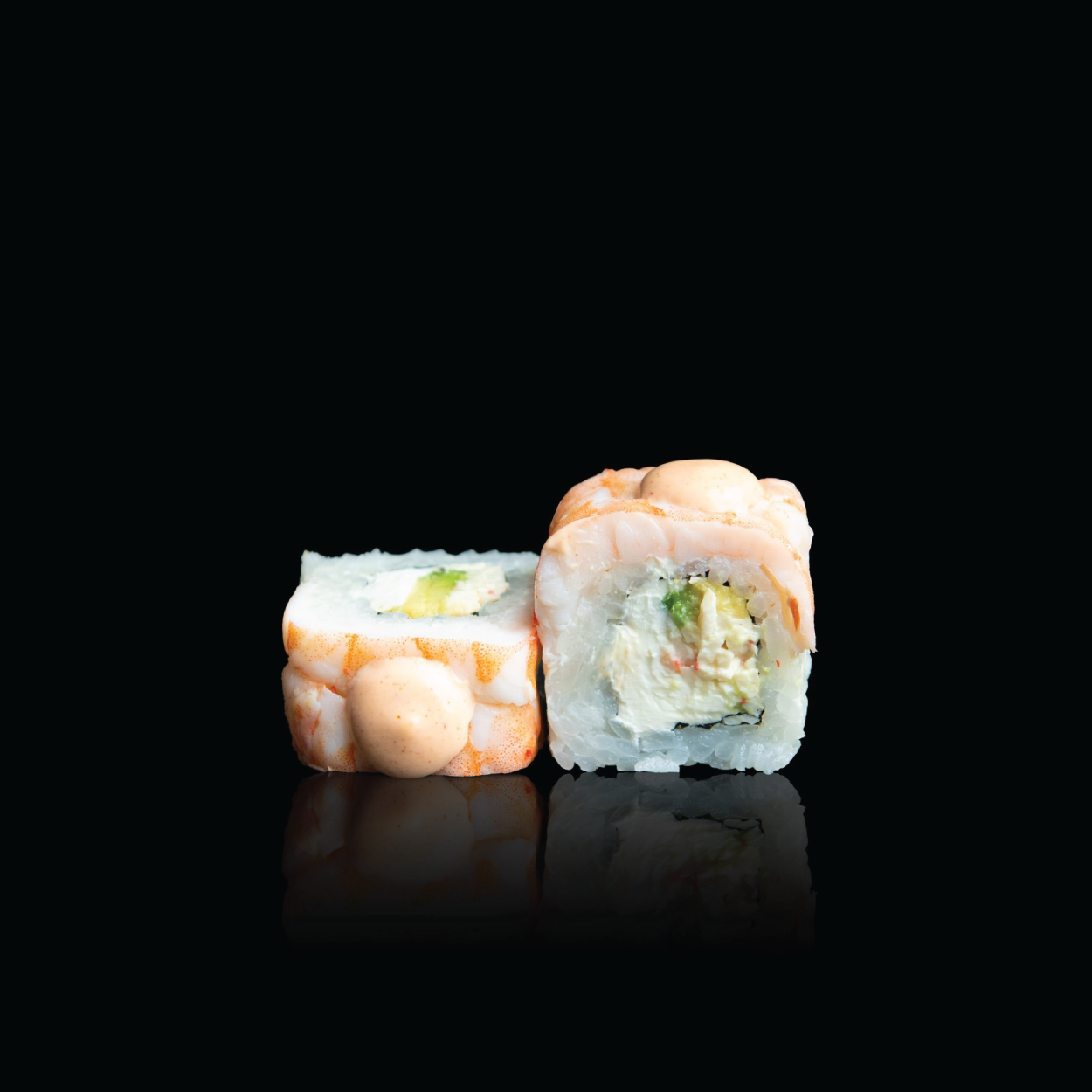 ბრინჯი, ნორი, კრევეტები, კრაბი, კრემ-ყველი, ავოკადო, სპაისის სოუსი, ჯინჯერი, ვასაბი, სოიოს სოუსი.